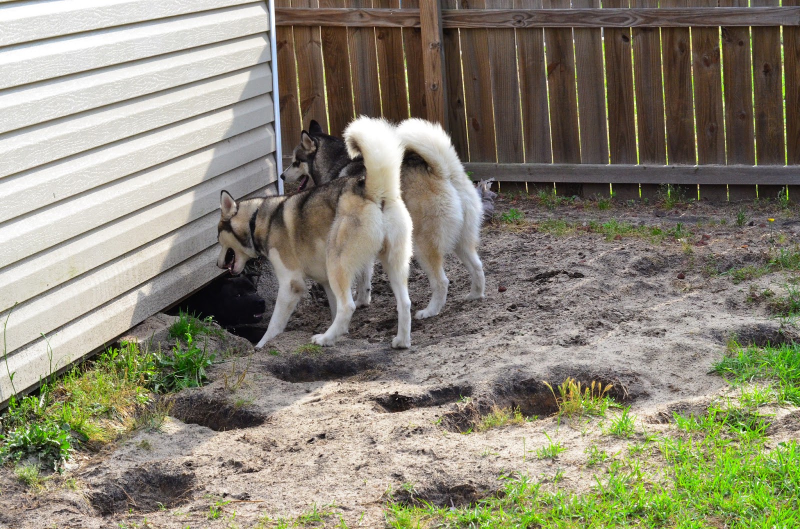 You know, funny enough, I don't believe I've ever caught Champ in the act of digging. It's always been harder to detect dirt on him because he's so dark already, while we know when the huskies have been digging because their usually white snouts and paws are covered in dirt. I've caught both the huskies, many times, digging away-- usually not big holes, but little ones, like they're investigating something a little deeper than the surface. The holes under the shed developed over time, until one day I saw all three pop out from under it, one after another, similar to seeing clowns popping out of a small car. I think Champ likes the holes for shade and cooling off. The huskies just like to investigate and be naughty-- we have a number of holes just big enough to twist your ankle in all over the yard now.